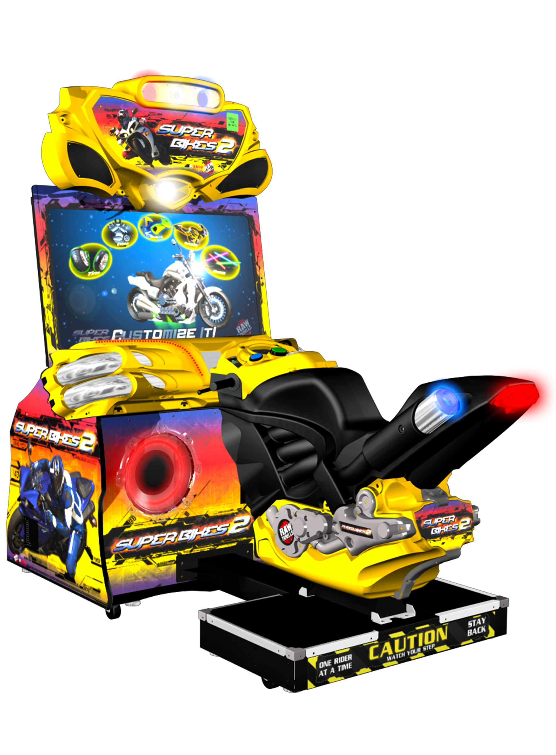 Calling all bikers! Super Bikes is now in Hi-Def! With a 42” LCD, 10 never-before seen tracks, all new light show and tons of electrifying effects, Super Bikes 2 will blow your mind! Race through Moab as fighter jets attack UFOs, descend into the haunted catacombs of Paris, and dodge giant worms in hyperspace. Escape elephants in the jungles of Thailand, jump through the flaming hoops of Vegas, run with the bulls in Spain and cruise through the unbelievable snow-covered mountaintops of the Himalayas. Choose from 9 riders and 12 bikes with multiple tricked-out upgrades for engines, decals, tires and more! Players can create a unique PIN to save and track their statistics. Super Bikes 2 retains all the exciting components as the original Super Bikes, and is built on a highly reliable system featuring RIO and DELL computers.