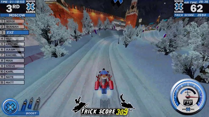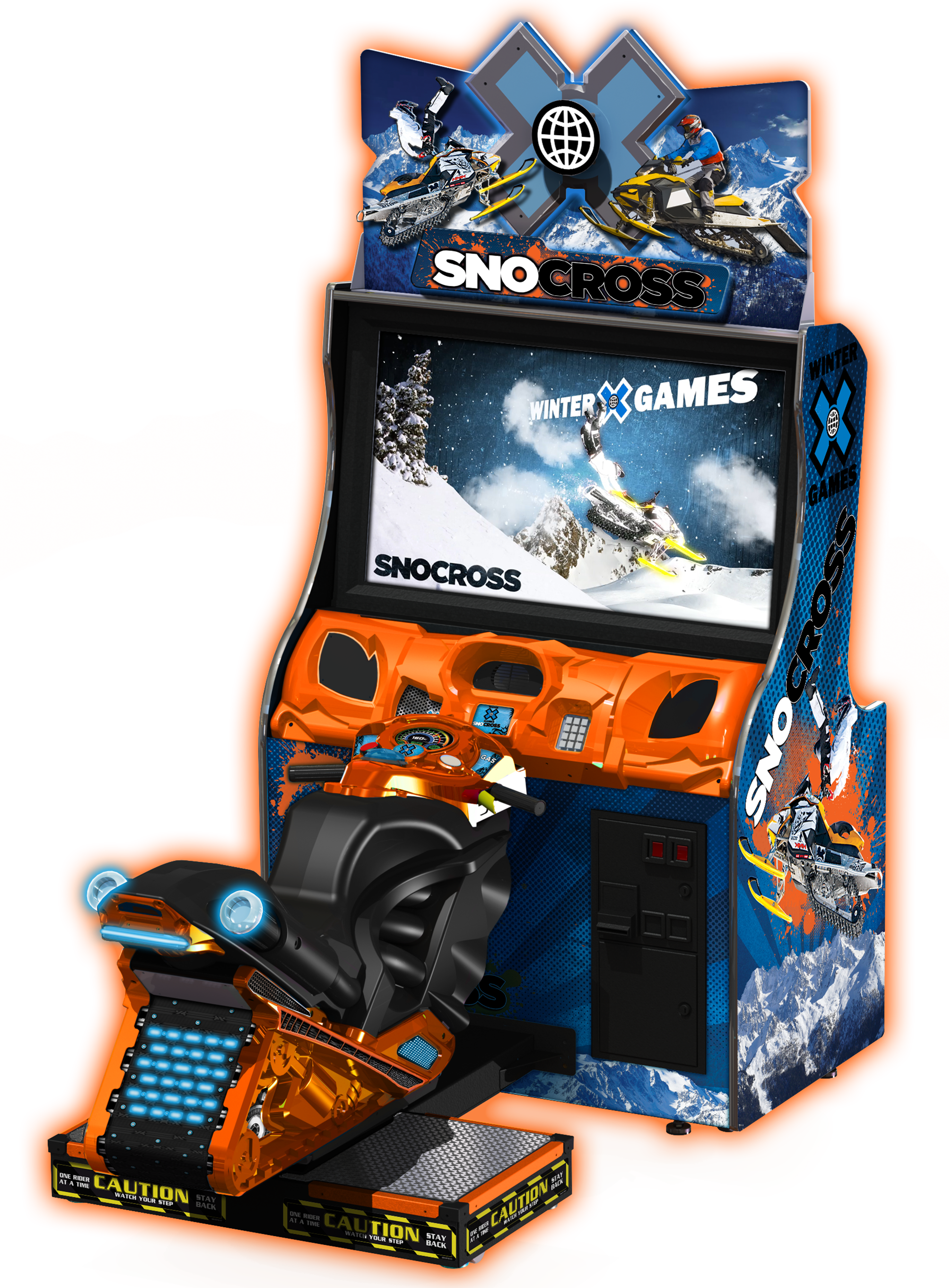 Finally Be Part Of The Winter X Games SnoCross is the latest racer from Raw Thrills. A 42″ LCD panel for HD graphics and a motion seat allows players to feel like they are part of the action. SnoCross has 6 snowmobile racers, 6 killer sleds, and insane custom upgrades. Plus travel the world by riding on 7 intense tracks in France, Antarctica, China, Alaska, Washington D.C., Moscow and Colorado. This game is officially licensed from ESPN and racers are able to perform the same sick tricks as seen in the X Games. Huge airtime gives you even more time to try crazy tricks. Throw snowballs at your opponents to battle for the lead. You can also share your scores to Facebook via personalized QR codes. An ultra-high marquee and a brightly colored cabinet draw in players from across the room. Link up to 8 cabinets together to create a competitive atmosphere.
