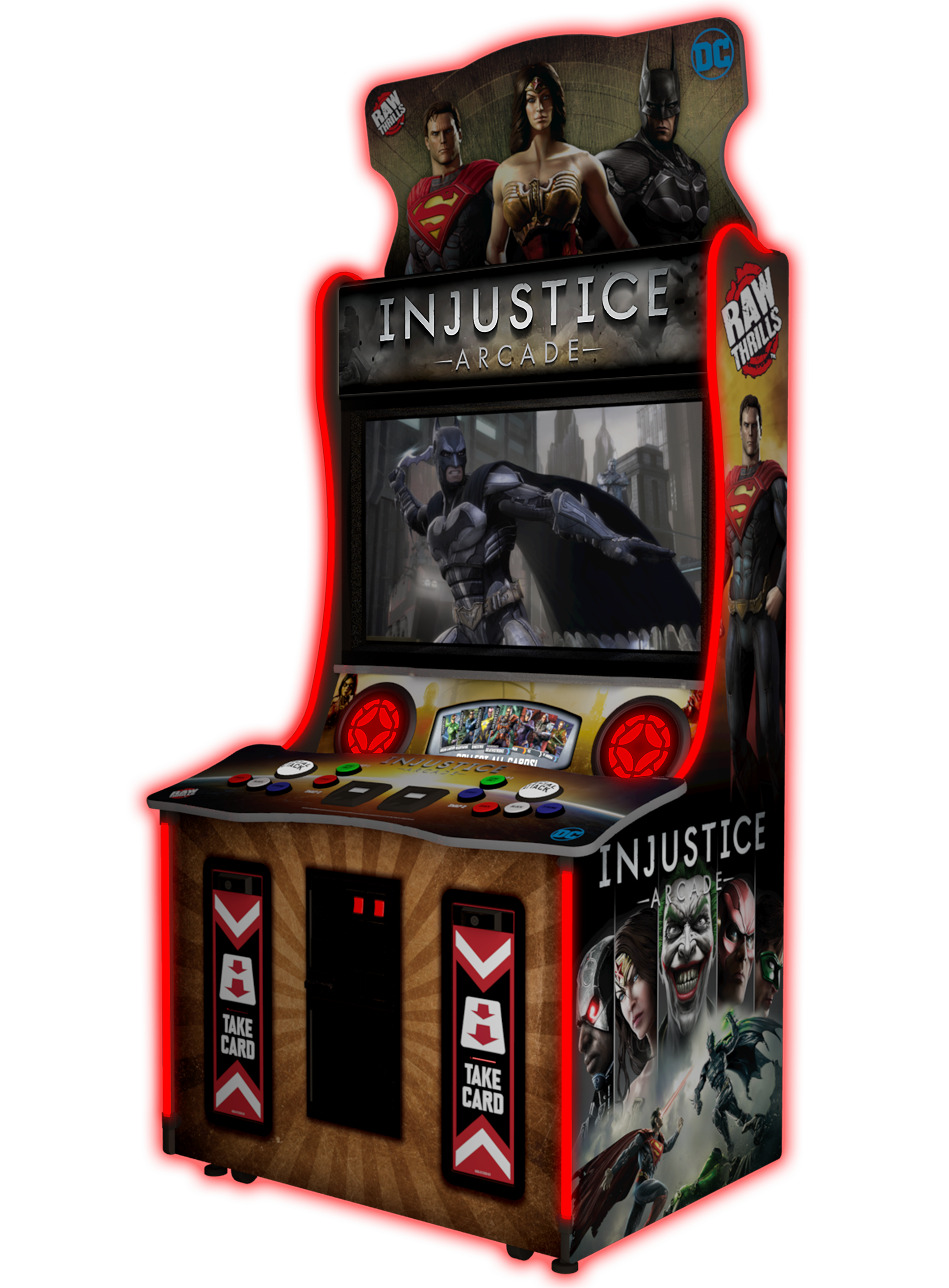 The action and adventure comes to the arcade with Raw Thrill’s new card-based fighting game DC Injustice! Based on the mobile game ‘Injustice: Gods Among Us’, ‘Injustice Arcade’ takes an already good game and makes it great! By scanning collectible character cards into the game, players can build teams of 3 and fight head-to-head or against the computer in an all out battle royale. After each game players are rewarded with one card vended from the machine to use for future fights. With 200 cards to collect, the action and fighting match-ups are virtually endless! Start collecting and fighting today with your favorite DC characters in this one-of-a-kind arcade game!