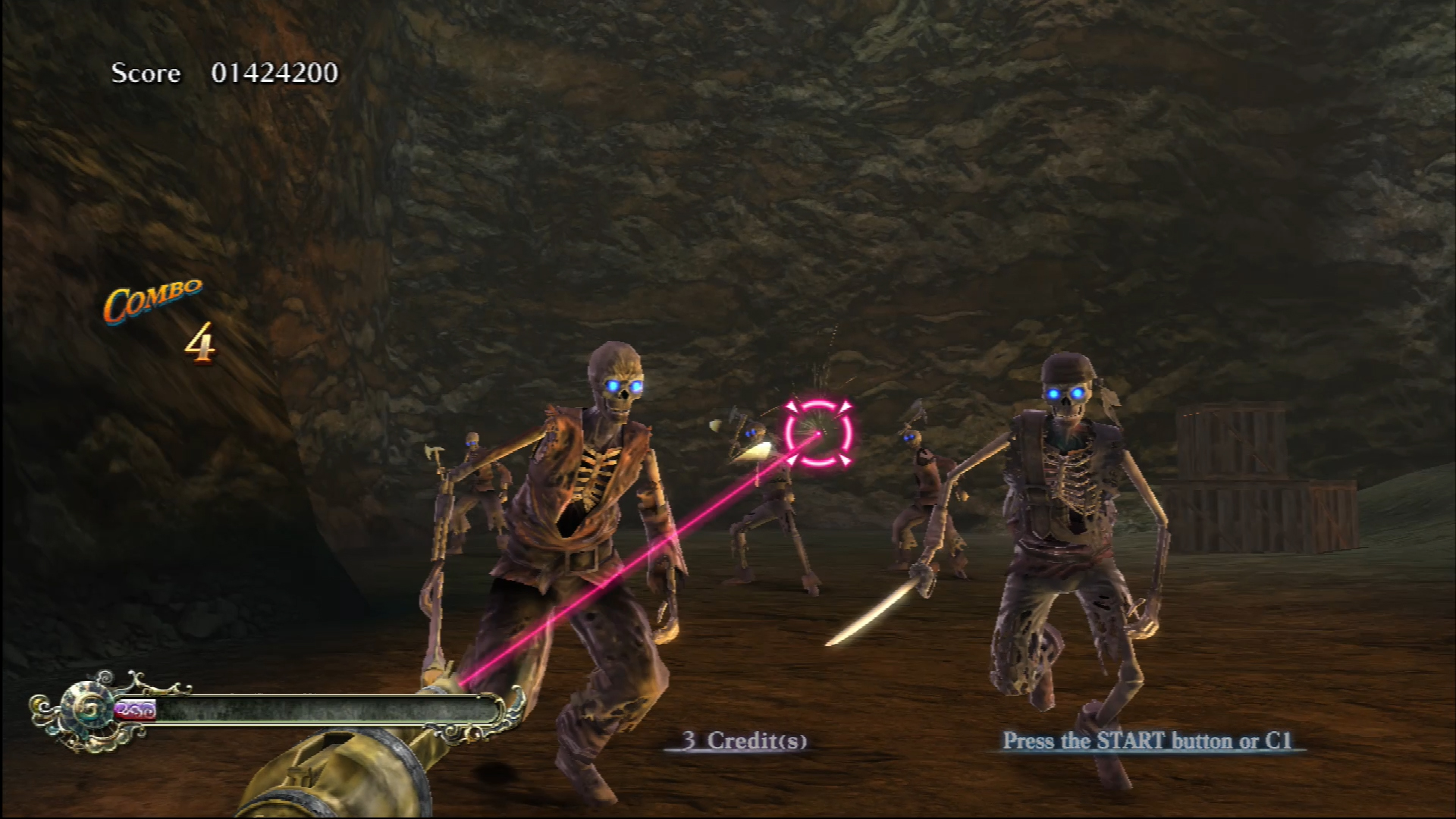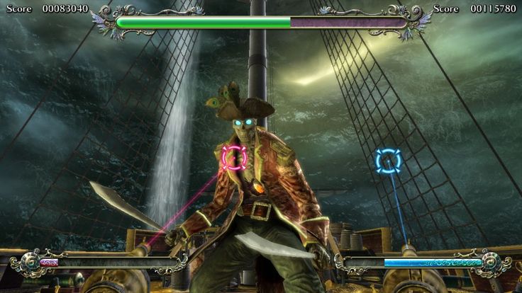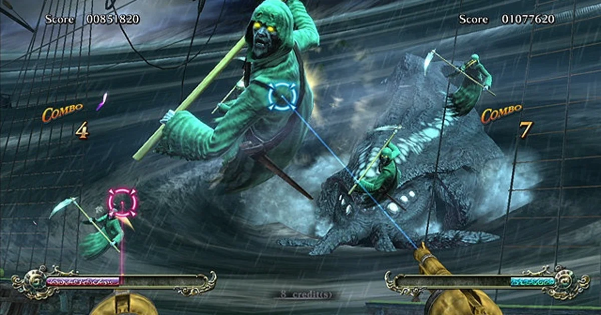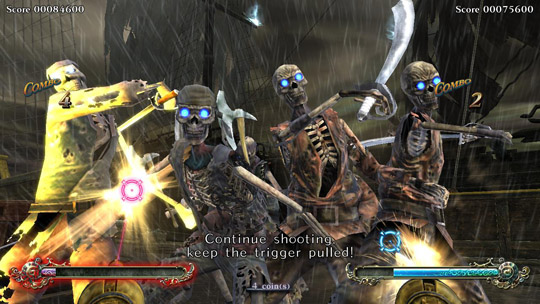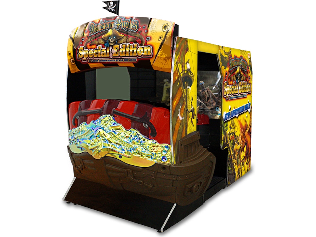Surround yourself in the "theater cabinet" of Deadstorm Pirates. Once inside, the player is immersed into the wonderful pirate story. You don't just play the game, you're in it! Unlike traditional shooters where players have to follow a set storyline and path, Deadstorm Pirates has 4 selectable stages giving players a fresh new adventure with each play. Play the game in the order you want. Players use both the recoiling gun and mounted steering wheel to shoot enemies and navigate through treacherous water all throughout the game. A new feature rewards cooperative play, a more powerful shot is created when players shoot the same target. See if you have what it takes to sail the stormy seas and claim "Poseidon's Breath."